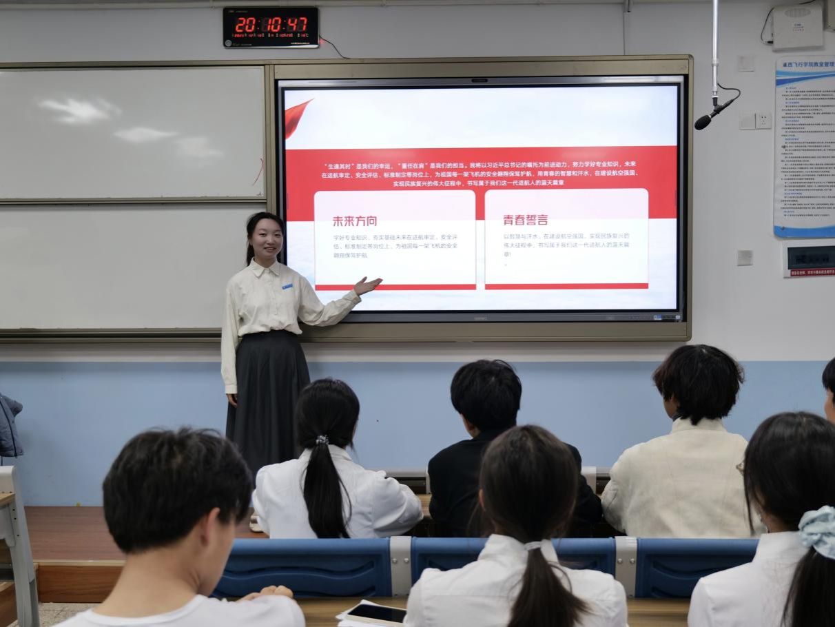 深化党建品牌,构建理论学习长效常态。 本次深入班级的系列宣讲,是飞行技术学院学生党支部持续深化“红翼领青蓝”党建品牌建设、扎实推进“每月班班学”活动走深走实的具体举措。“青蓝宣讲团”作为一支由学生党员、入党积极分子和优秀学生骨干组成的理论宣讲轻骑兵,始终秉持“党建带团建、党员带团员、团员带青年”的工作思路,每月定期走进各班级团支部,围绕党的创新理论、路线方针政策与时政热点开展宣讲交流。截至目前,宣讲团已累计开展12场宣讲,实现了全院各年级的有效覆盖。通过这种朋辈引领、互动研学的形式,有效打通了理论武装青年群体的“最后一公里”,切实增强了基层党团组织的政治功能与组织凝聚力,持续引领广大飞行学子坚定听党话、跟党走,努力将青春梦想融入航空报国的伟大实践,书写无愧于时代的璀璨华章。